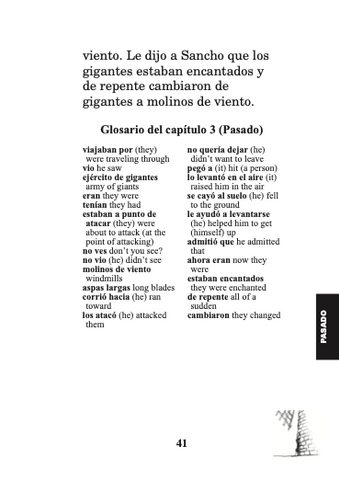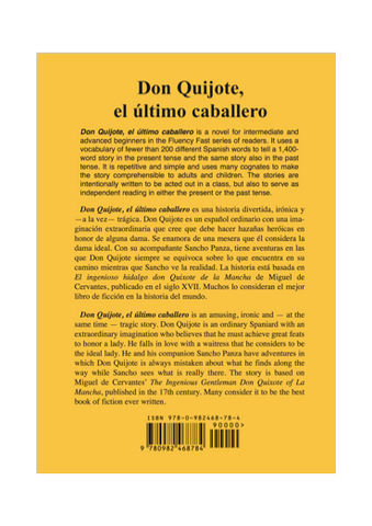 Don Quijote, el último caballero is a novel for intermediate and advanced beginners. It uses a vocabulary of fewer than 200 different Spanish words to tell a 1,400-word story in the present tense and the same story also in the past tense. It is repetitive and simple and uses many cognates to make the story comprehensible to adults and children. The stories are intentionally written to be acted out in a class, but also to serve as independent reading in either the present or the past tense.