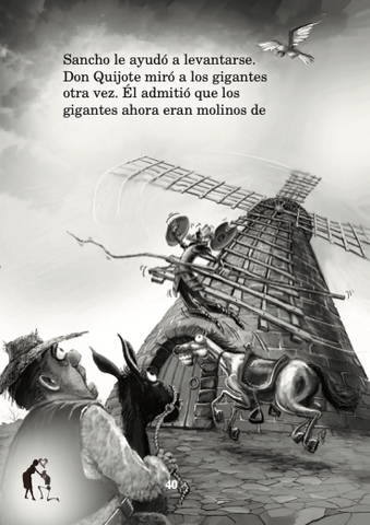 Don Quijote, el último caballero is an amusing, ironic and — at the same time — tragic story. Don Quijote is an ordinary Spaniard with an extraordinary imagination who believes that he must achieve great feats to honor a lady. He falls in love with a waitress that he considers to be the ideal lady. He and his companion Sancho Panza have adventures in which Don Quijote is always mistaken about what he finds along the way while Sancho sees what is really there. The story is based on Miguel de Cervantes The Ingenious Gentleman Don Quixote of La Mancha, published in the 17th century. Many consider it to be the best book of fiction ever written.